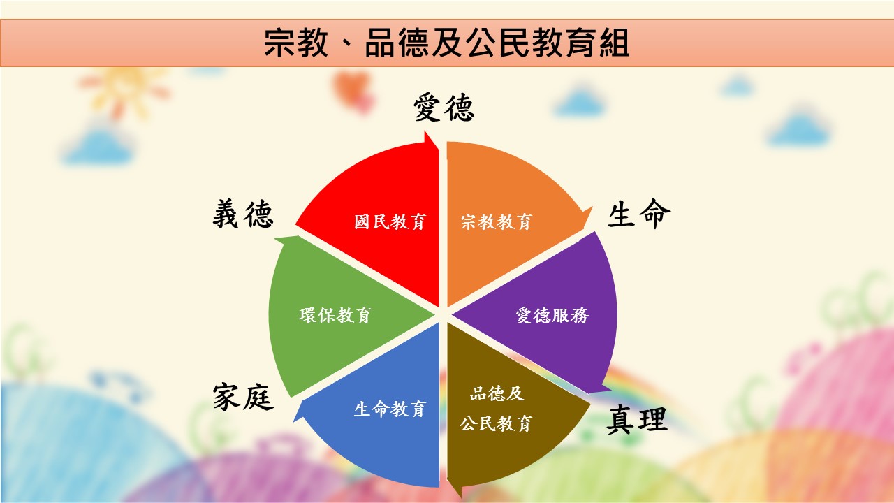 宗教、品德及公民教育組透過天主教教育五大核心價值連繫六個工作範疇,包括宗教教育、國民教育、愛德服務、品德及公民教育、環保教育及生命教育,培養學生不同方面的能力,讓學生積極投入校園生活,尋得個人理想,熱愛生命,從而認識生命的意義、積極面對挑戰、尊重和愛惜生命、追求理想和探索未來。