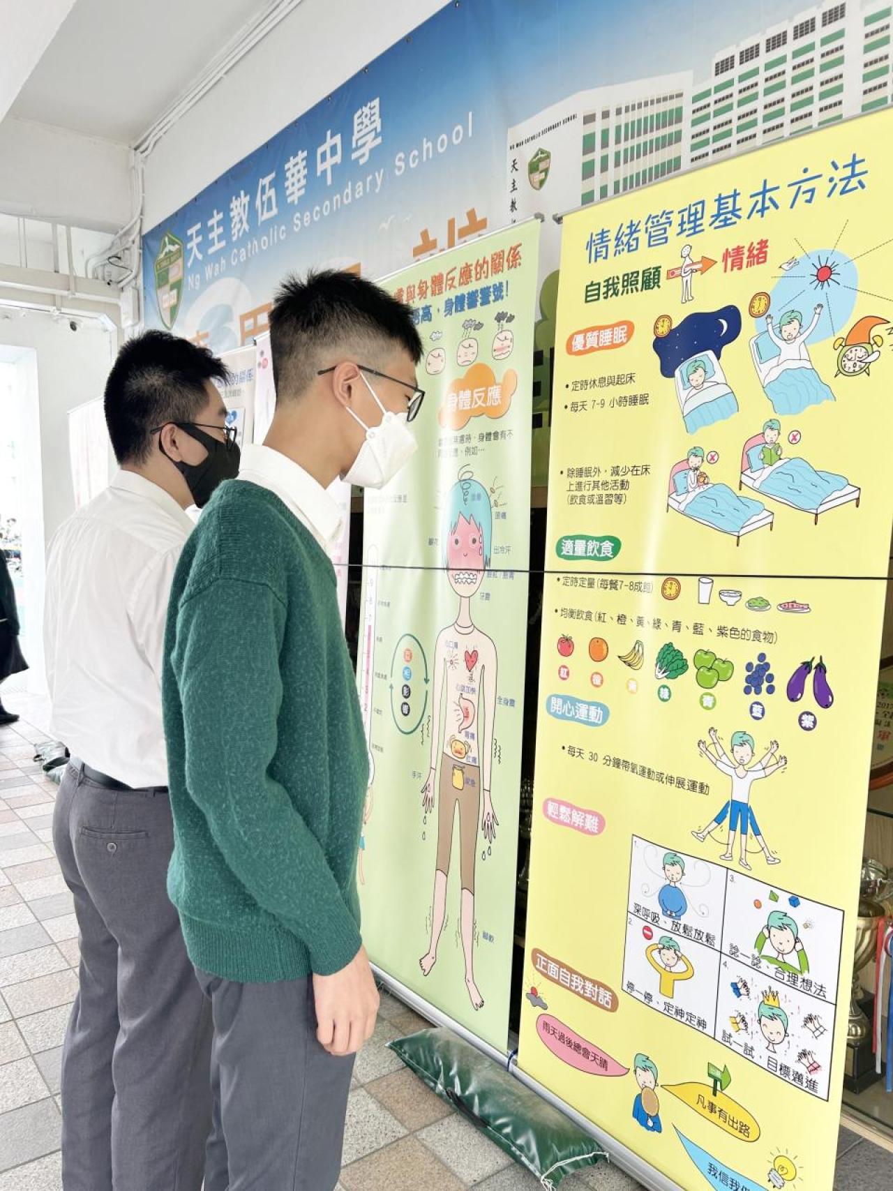 2023-11-16 為讓同學認識情緒,學習提升精神健康的方法。輔導組於11月13至16日,於午膳時間,透過展覽及問答遊戲,聚焦讓同學認識——焦慮是一種與生俱來的情緒,從而學習如何面對,以及提升精神健康。例如:經常強健身體,保持良好的體格,這不單是自律自愛、盡責任的表現,更是與精神健康相輔相成、互為一致。而在活動期間,同學們都踴躍參與,積極填寫網上問答遊戲,氣氛熱烈。相信若大家都能提升精神健康,對學業社交各方面的發展,均能相得益彰。 活動剪影
