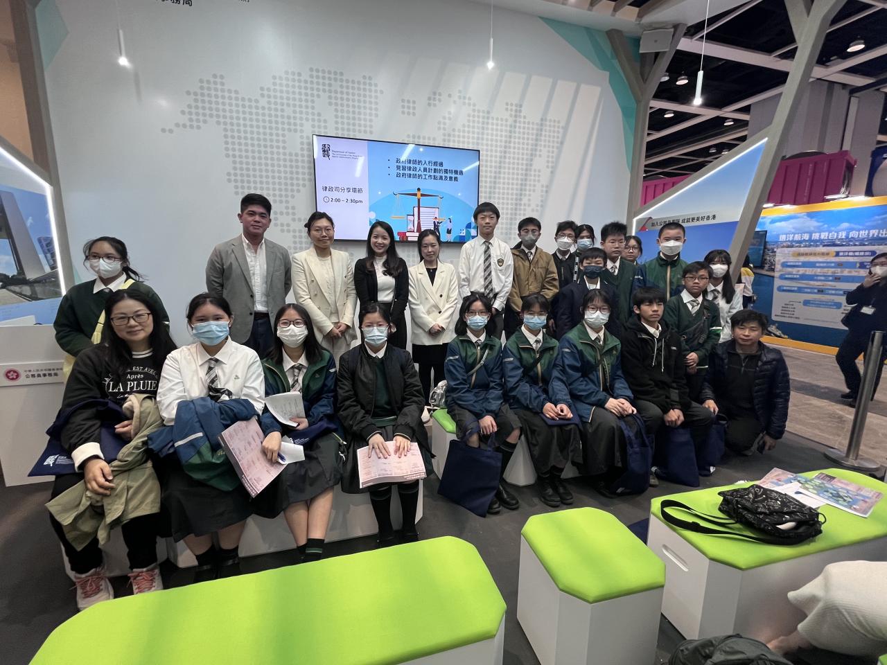 2024-01-27 生涯規劃組於1月27日參加由教育局主辦的「認識公務員職系講座系列 (政府律師職系)-教育及職業博覽」,帶領17位中一至中三學生到灣仔會議展覽中心出席公務員職系介紹講座及參觀香港教育及職業博覽。當天學生出席律政司介紹講座,了解到律政司的工作特質及工作點滴,認識到成為律師的入職要求及所需技能。 活動剪影