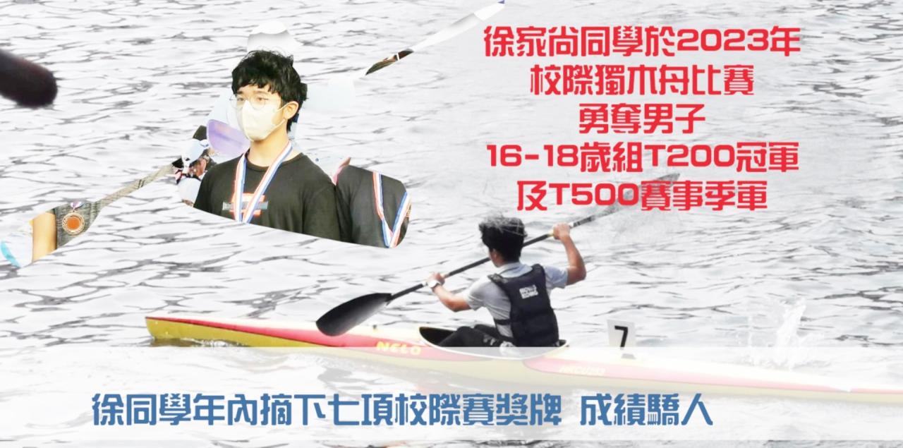 徐家尚同學年內摘下七項校際賽獎牌,成績驕人。徐家尚同學再下一城,繼本年於不同校際賽五度獲獎後,再於10月15日舉行的2023年校際獨木舟比賽勇奪男子16-18歲T200賽事冠軍及T500賽事冠軍,可喜可賀。