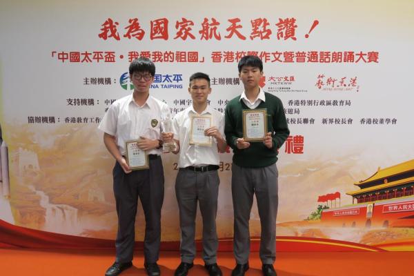 由太平保險集團主辦,香港大公文匯傳媒集團、藝術香港聯合主辦的「我為國家航天點讚!『中國太平杯·我愛我的祖國』香港校際作文暨普通話朗誦大賽」。本屆賽事近百間香港中學、300多名中學生的踴躍報名,參賽選手從不同角度寫作,表達對國家航天事業30年成就的感想和點讚。經過初賽、複賽的多輪選拔後本校5A張家信、5A楊岳霖及4A劉鎮華奪得三等獎。