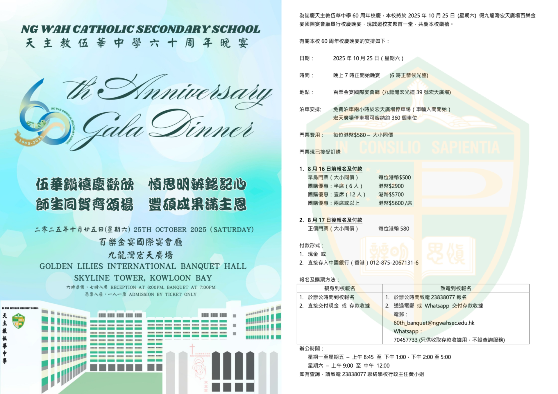 本校60周年校慶晚宴將於10月25日(六)隆重舉行,門票將於2025年10月3日截止發售,各位校友、家長請把握最後機會共襄盛舉!