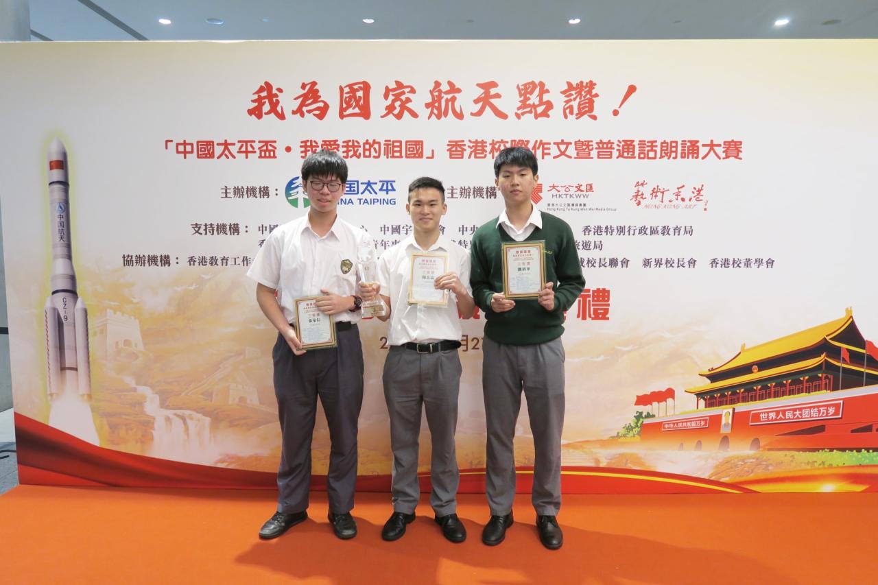 由太平保險集團主辦,香港大公文匯傳媒集團、藝術香港聯合主辦的「我為國家航天點讚!『中國太平杯·我愛我的祖國』香港校際作文暨普通話朗誦大賽」。本屆賽事近百間香港中學、300多名中學生的踴躍報名,參賽選手從不同角度寫作,表達對國家航天事業30年成就的感想和點讚。經過初賽、複賽的多輪選拔後本校5A張家信、5A楊岳霖及4A劉鎮華奪得三等獎。