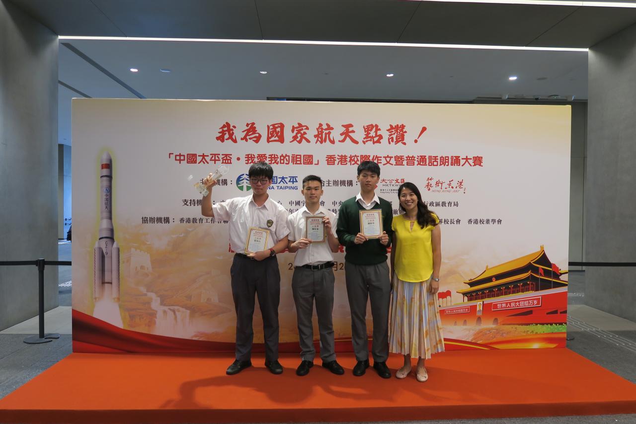 由太平保險集團主辦,香港大公文匯傳媒集團、藝術香港聯合主辦的「我為國家航天點讚!『中國太平杯·我愛我的祖國』香港校際作文暨普通話朗誦大賽」。本屆賽事近百間香港中學、300多名中學生的踴躍報名,參賽選手從不同角度寫作,表達對國家航天事業30年成就的感想和點讚。經過初賽、複賽的多輪選拔後本校5A張家信、5A楊岳霖及4A劉鎮華奪得三等獎。