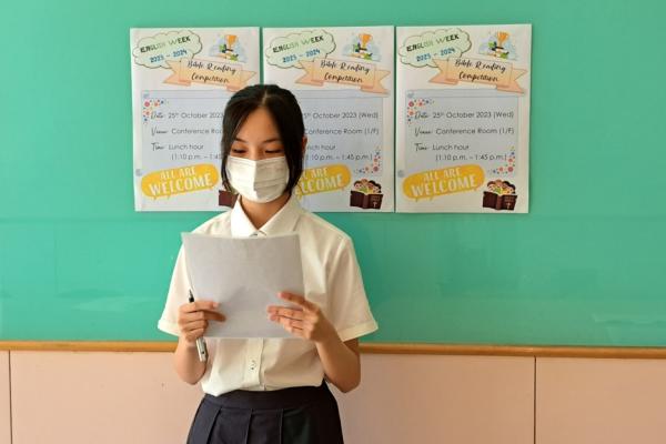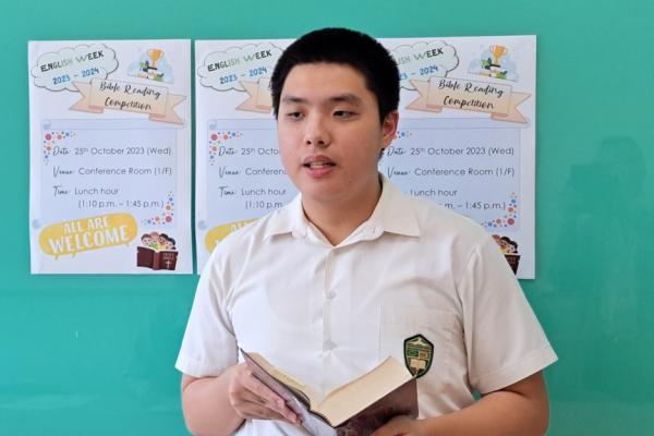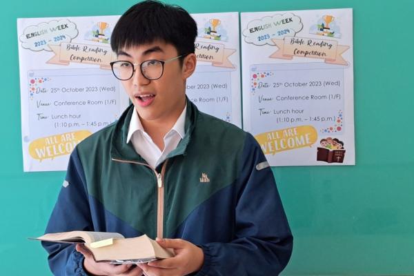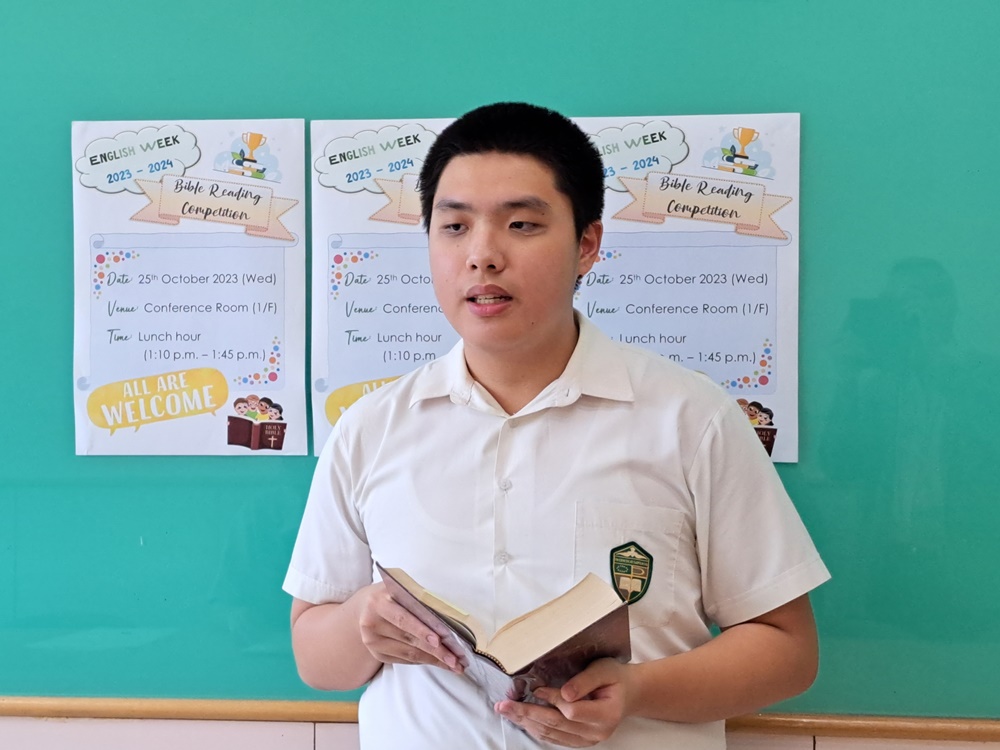 With the support of all the Panel Members of the English Department and our Ng Wah boys and girls, the “Bible Reading Competition” was successfully held in our Conference Room during Lunch Hour on 25th October, 2023 (Wednesday) to celebrate our English Week in this academic year. There were total 77 competitors joining this competition. Special thanks to our adjudicator, Mr WK Liu (The Panel Chairperson of S1 to S6 Ethics & Religious Education).