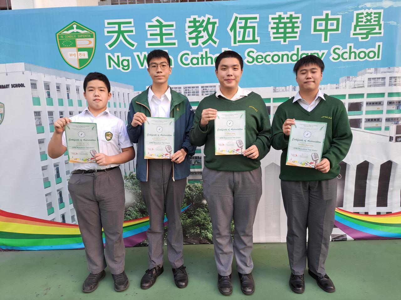FOUR students from S4A and S4B including Leung Chun Yin (S4A), Tang Ho Yin (S4A), Jacky Li (S4B) and Wong Hoi Nam (S4B) got the Certificate of Appreciation of “SOW Motivational Talk Contest” in the Campaign on “Promoting Positive Values and Attitudes through English Sayings of Wisdom” 2023 by Curriculum Development Institute, Education Bureau.